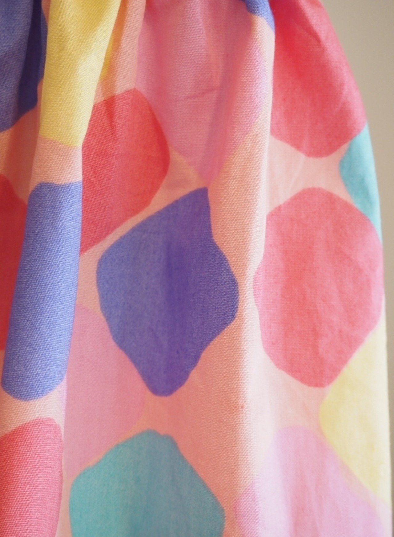 ♪上身頃は落ち着いたコーラルピンク、スカート部分はカラフルな幾何柄。