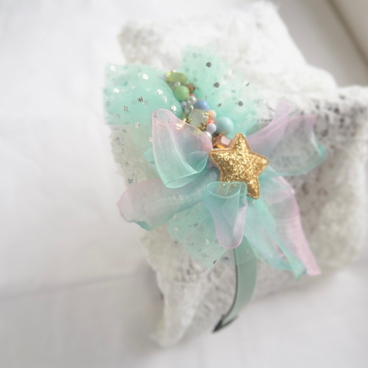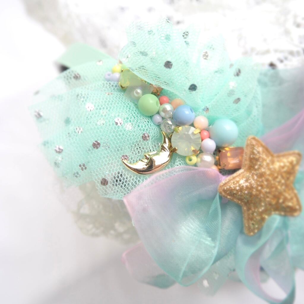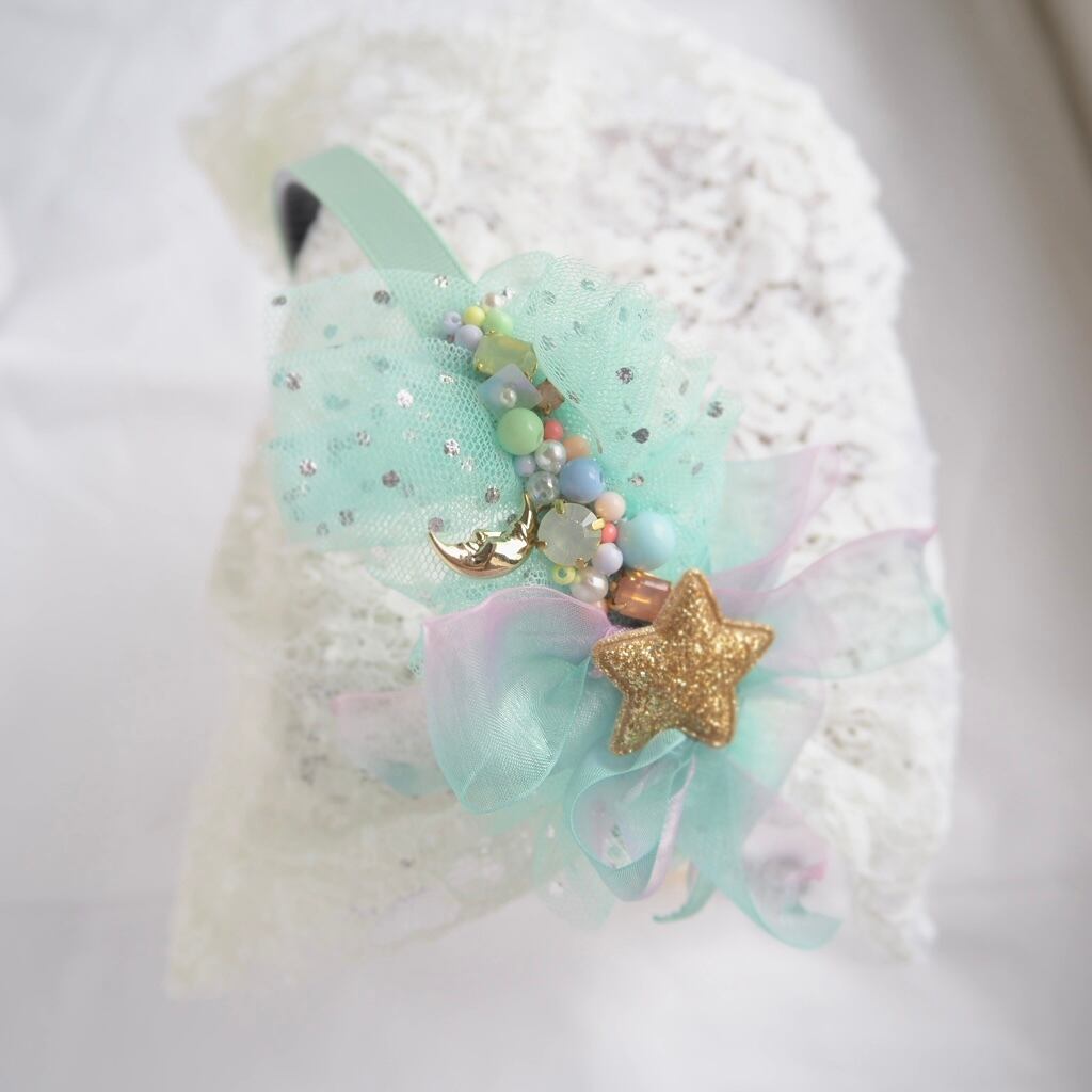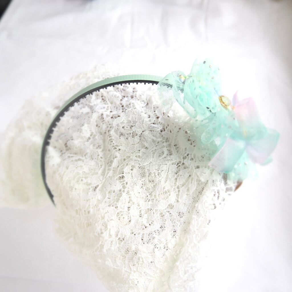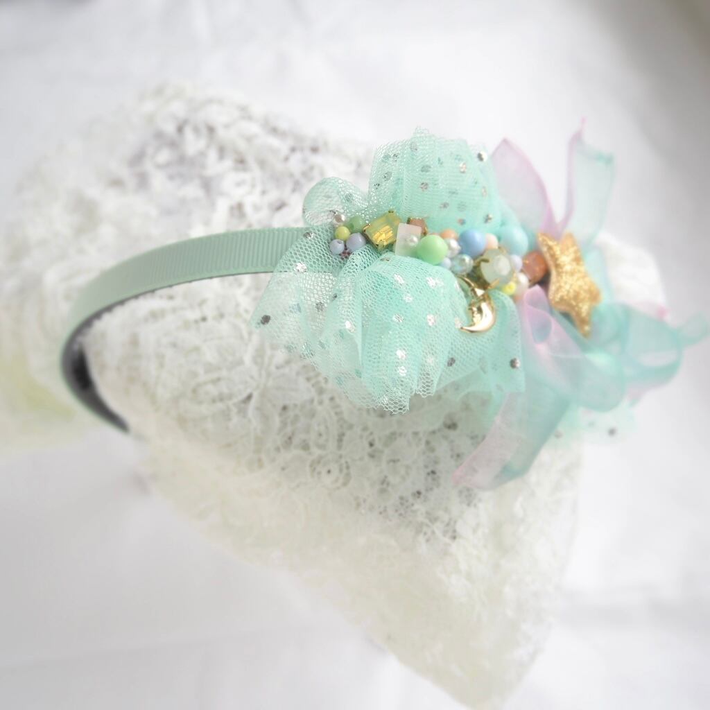 キラキラチュールとふわふわリボンが可愛らしいゆめかわカチューシャ。1点もので、他にはない特別感が漂います。女の子が大好きなかわいいアイテムをお探しの方にぴったりの逸品です。ヘアアレンジにプラスするだけで、一気に可愛らしさがアップします♪